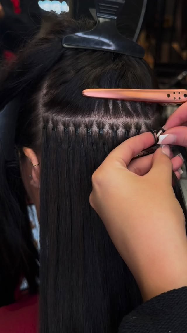 Tracks are created using beads then wefts of hair are stitched onto these tracks. Suited to clients who already have some length to their hair and don’t require specific placement or coverage.