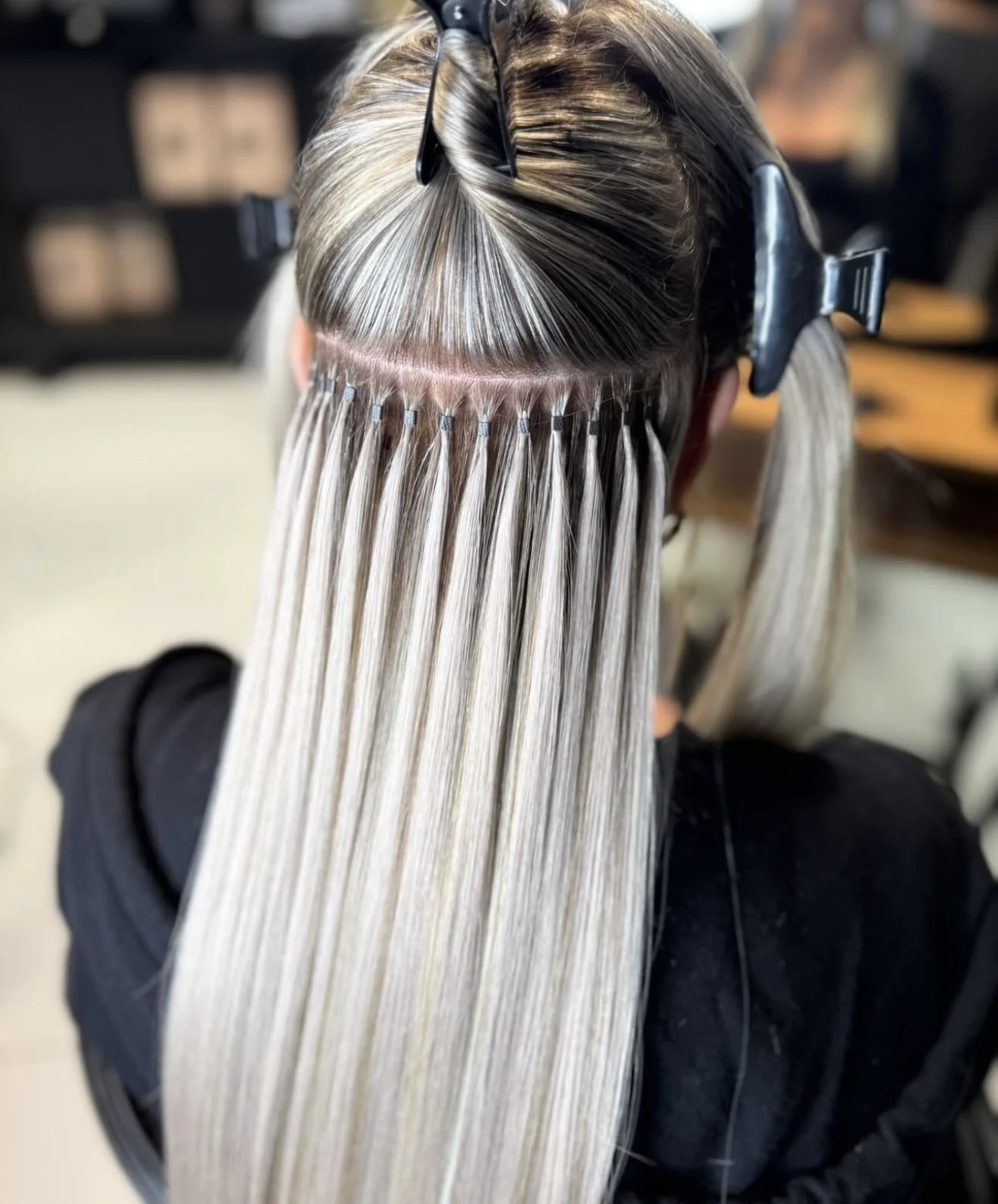 Six weekly maintenance is required. It is important that we ensure, as with all methods, that your hair is kept safe throughout the wear of the hair extensions. At this appointment we rotate the hair extensions that are located at the nape of the neck and the side sections (the most fragile areas). We also check through the hair extensions to ensure they are being cared for correctly at home and advise any changes to the aftercare routine that need to be made. It’s also a great opportunity to add extra hair extensions if a refresh or more thickness is required and the hair is trimmed to ensure it is kept in good condition.